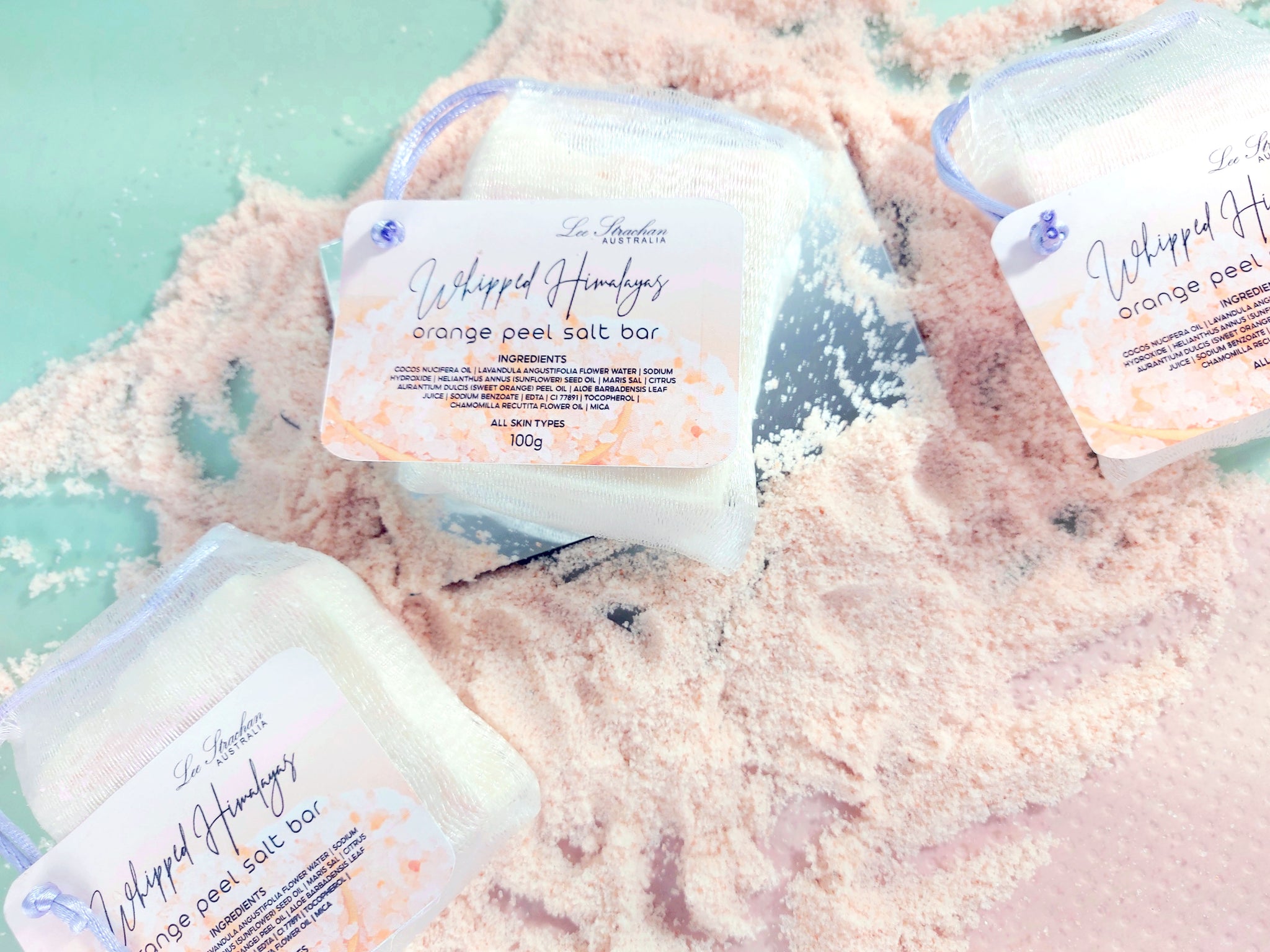 How to use: Your Whipped Himalayas is packed ready for bathing & creamy exfoliating. Simply peel off the wrapper, wet and lather through. It is wrapped in a skin friendly exfoliating pouch. Enjoy the benefit of our creamy exfoliating Himalayan Salt Bar with its energizing Orange Peel Oil. For daily use.