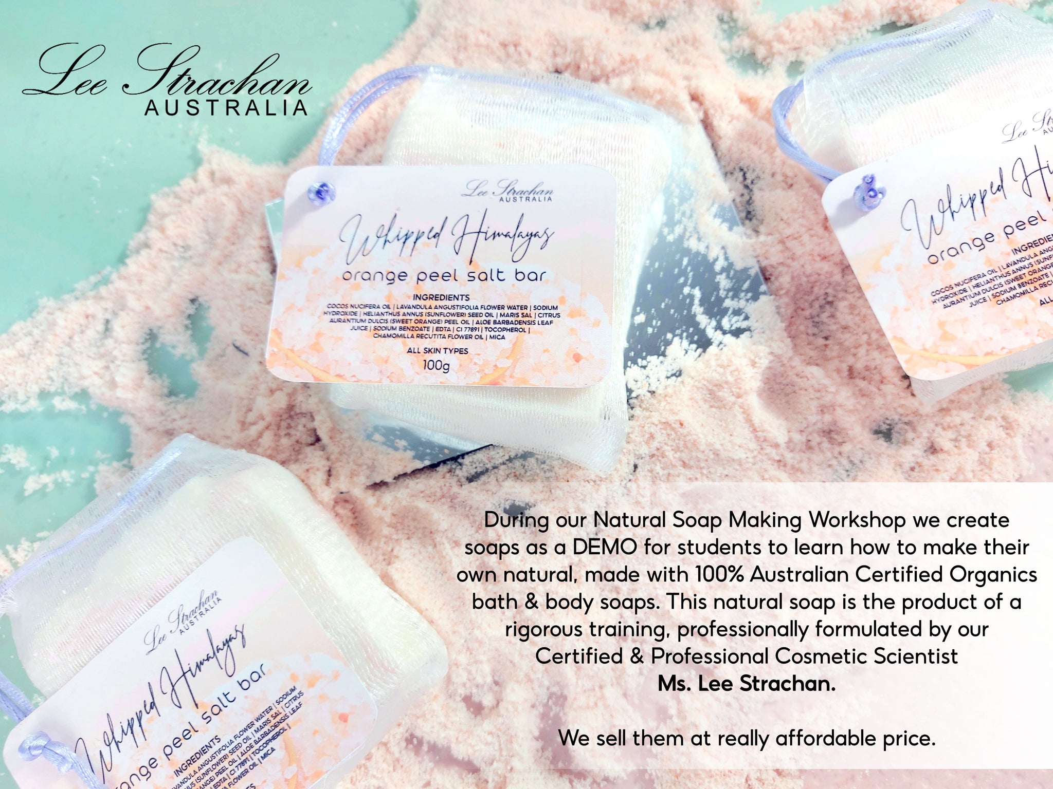 *During our Natural Soap Making Workshop we create soaps as a DEMO for students to learn how to make their own natural, made with 100% Australian Certified Organics bath & body soaps. This natural soap is a product of comprehensive training, professionally formulated by our Certified & Professional Cosmetic Scientist Ms. Lee Strachan. We sell them at really affordable price.